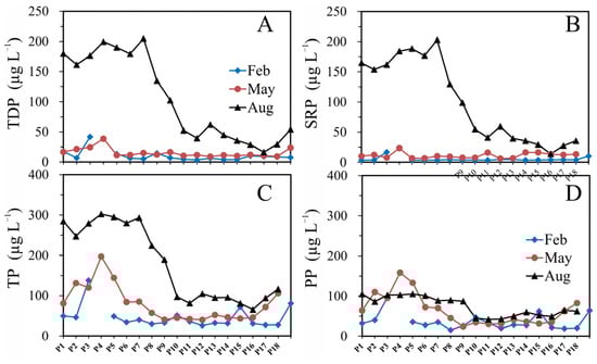 Basic water quality properties are presented in Table 3. Water depth, temperature, conductivity, TDS, salinity, and pH, as well as concentrations of TDN, NH4+, TN, and COD, showed notable seasonal variations. Concentrations of TDP, SRP, and TP displayed similar seasonal variations as those of available P in sediments, with the concentrations in August being significantly higher than in February and May. Concentrations of TDP, SRP, and TP were also higher at points close to the river entrances (P1–P5) compared to other sampling points (Figure 4). PP concentrations were comparable in May and August and were significantly higher than in February. The proportions of PP in TP were 77% in February and 81% in May, significantly higher than the 41% observed in August.