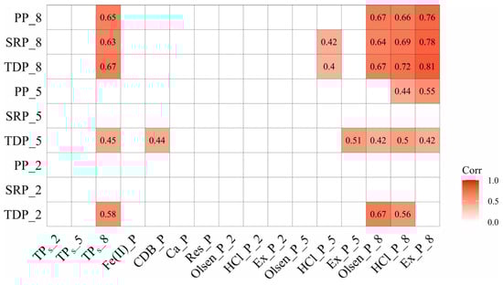 Correlations between sediment P fractions and P indexes with the concentrations of TDP, SRP, and PP in the overlying water sampled in February, May, and August 2022. Numbers are significant correlation coefficients at the significance level of p < 0.05.