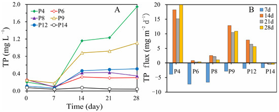 (A) Variations in total P concentrations in the overlying water and (B) diffusive total P fluxes during the static sediment incubation.