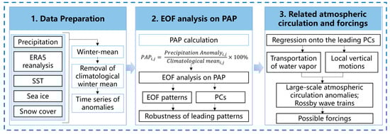 This study’s flowchart consists of three main steps (Figure 1): (1) For each variable listed in Table 1, we derive the three-dimensional anomaly field by calculating the winter mean and subsequently removing the corresponding climatological mean during 1950–2023. (2) PAP is calculated (Equation (1)) and used as input for the EOF analysis. This analysis is conducted using the Python package eofs (version 1.1.0) [30], from which we obtain the leading EOF patterns and corresponding PCs. To assess the robustness of these spatial patterns, we employ a Rotated EOF (REOF) analysis using the NCAR Command Language (NCL version 6.6.2, [31]). (3) The PCs are used as indexes for the regression analysis. We assess the local vertical motions and water vapor transport associated with the PCs. Subsequently, we calculate the large-scale atmospheric circulation anomalies to find key circulation systems. Wave activity flux (Equation (38) in [32], denoted as TNflux) is used to trace the propagation of Rossby wave trains. Furthermore, to identify possible external factors and key regions, regression analyses on SST, SIC and snow cover are conducted.