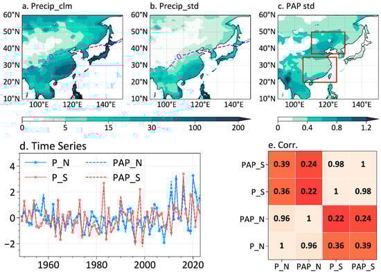(a) Winter mean P (mm/month) in EA during 1950–2023; (b) standard deviation of winter P in EA; (c) same as (b), but for PAP; (d) time series of area-mean winter P/PAP (solid/dashed lines) in NEA (in blue) and southern EA (in red); (e) heatmap of c.c. between the four time series in (d), with long-term trends removed. The upper and lower boxes in (c) represent the NEA (37–50° N, 110–130° E) and the southern EA (20–35° N, 115–125° E) regions, respectively. The purple contours in (a,b) indicate the isoline of zero surface air temperature. All the time series in (d) were normalized by their respective standard deviations to ensure comparability.
