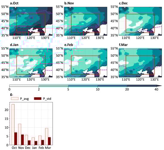 (a–f) Climatological mean winter P in NEA from October to March, respectively. (g) The area-averaged winter P in NEA (light red bars) along with its standard deviation (dark red bars) for the same period. Red boxes in (a–f) indicate the NEA region. The purple contours in (a–f) indicate the isoline of zero surface air temperature.