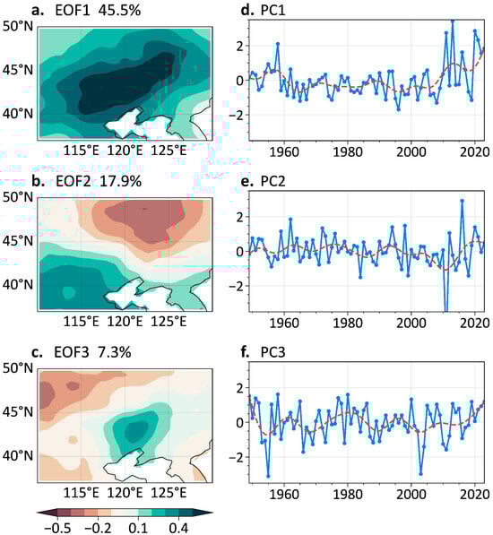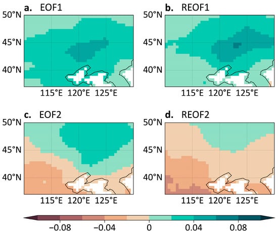 To assess the sensitivity of the EOF analysis, we expanded the EOF analysis region from NEA (37–50° N, 110–130° E) to a slightly larger area of (32–55° N, 105–135° E). As shown in Figure 13a,b, the spatial patterns of the two leading EOF modes are nearly identical to those in Figure 4a,b, with the c.c. between PCs exceeding 0.99. These results indicate that the EOF result is relatively robust to variations in the analysis region.