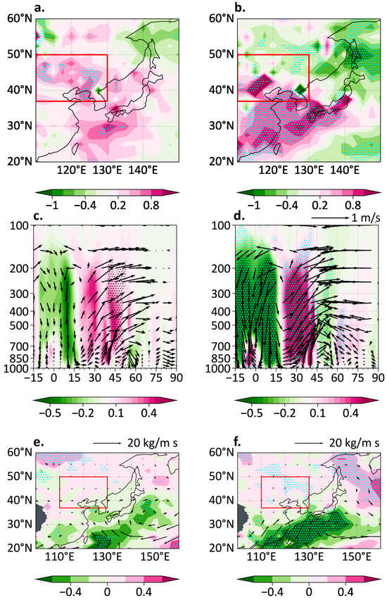 Atmospheric circulation anomalies regressed onto PC1 (a,c,e) and PC2 (b,d,f). (a,b) 500 hPa vertical velocity (−102 Pa s−1). (c,d) Local Hadley cell averaged along 110–130° E. The black vectors indicate meridional wind (m s−1) and vertical velocity (amplified by a factor of 102, Pa s−1); the legend for these vectors is shown at the top right of (e). (e,f) Water vapor transportation flux (1000–300 hPa, vectors, kg m−1s−1) and its divergence (color, 10−5 kg m−2s−1). Areas with dotting indicate where p-values are ≤0.1, highlighting statistically significant regions. Red boxes in (a, b, e, and f) represent the NEA region (37–50° N, 110–130° E).