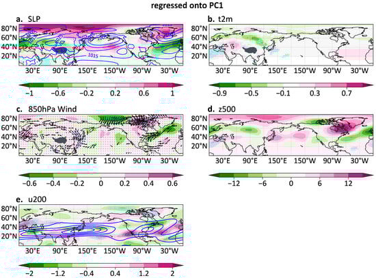 Regression patterns onto PC1: (a) SLP (color, hPa), (b) T2M (degrees Celsius), (c) horizontal winds at 850 hPa (black vectors, m s−1), with meridional wind colored, (d) 500 hPa geopotential height (Z500, m), and (e) 200 hPa zonal wind (color, m s−1). Areas with dotting indicate where p-values are ≤0.1, highlighting statistically significant regions. In panel (a), the contours represent the climatological mean of winter sea level pressure (SLP), ranging from 1000 hPa to 1030 hPa, with intervals of 5 hPa. In panel (e), the blue contours depict the winter mean of the zonal wind at 200 hPa, with contour levels at 20, 30, 40, 50, and 60 m/s.