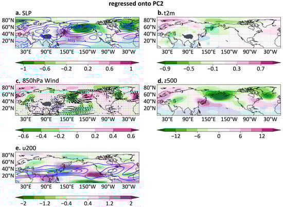 Figure 7 is the same as Figure 6, but regressed onto PC2. We observe a northeastern-shifted AL, with anomalous high pressure near Japan. Concurrently, anticyclonic flows appear over the EA–Northwest Pacific (NWP) region, facilitating the northward movement of warm, moisture air from the tropical oceans. In the middle of the troposphere, a Western Pacific-like pattern appears [37], linking to the variations in SLP and near surface temperatures. Specifically, the northern cyclonic flow induces cold anomalies near the Okhotsk Sea, while the southern anticyclone flow contributes to warm anomalies over southern China–southern Japan. The core of the EA jet stream weakens, but westerly acceleration occurs to the north of the jet. These jet variations are associate with changes in local meridional circulation (Figure 5d), including a weakened local Hadley cell and weakened Ferry cell [35]. In summary, variations in PC2 are closely linked to a northwestern-shifted AL, a weakened EAWM in both its northern and southern modes, a Western Pacific-like pattern, a diminished westerly jet core, and accelerated westerlies to the north of the jet.