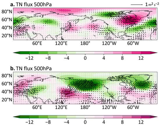 Regression patterns of 500 hPa TN flux (black vectors, m2 s−2) and geopotential height (color, m) onto (a) PC1 and (b) PC2.