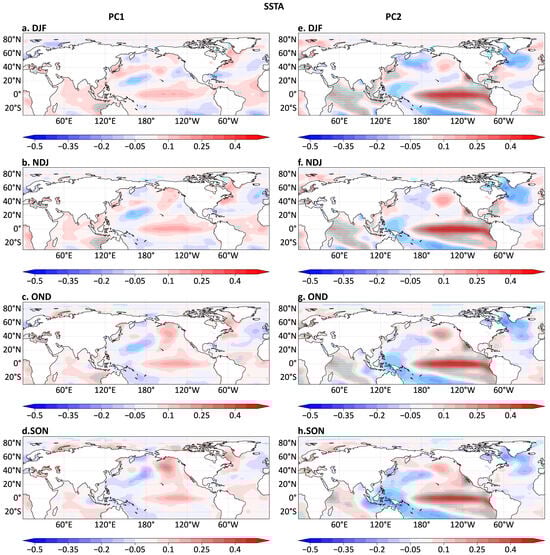 (a–d) SST anomalies regressed onto PC1 (left column) from the contemporaneous winter (DJF) to the previous autumn (SON). (e–h) as (a–d) but for PC2. Areas with dotting indicate where p-values are ≤0.1, highlighting statistically significant regions.