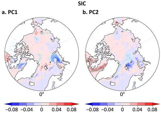 The SIC variations associated with PC1 and PC2 are illustrated in Figure 10. Our analysis focused on early winter (November–December mean) since SIC variations are minimal in late winter months. For PC1, we observe a reduction in SIC in the Barents–Kara Seas (BKS), correlating with warm conditions during autumn (Figure 9d). This reduction in BKS SIC contributes to a warmer Arctic and colder northeastern Eurasia (Figure 6b) [40,41]. Conversely, for PC2, there is an increase in SIC near Baffin Bay.
