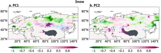 Regression of snow depth water equivalent anomalies onto (a) PC1 and (b) PC2. Areas with dotting indicate where p-values are ≤0.1, highlighting statistically significant regions.