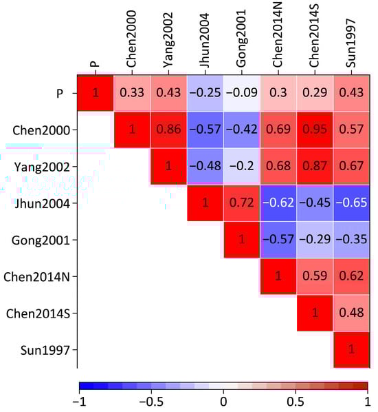 We conducted a comparative analysis of winter P in NEA and the EAWM. Specifically, Figure 12 presents the c.c. between the area-mean winter P in NEA and seven EAWM indexes defined in previous studies. These indexes capture different aspects of the EAWM system: the Chen2000 [43] and Yang2002 [34] indexes represent variations in the lower-layer meridional wind over EA; the Jhun2024 [44] index reflects zonal wind shear along the westerly jet; the Gong2001 [45] index is based on the strength of the SH; the Chen2014N and Chen2014S [20] indexes indicate 1000 hPa meridional wind variations in northern and southern EA, respectively; and the Sun1997 [46] index measures the intensity of the EAT. Notably, the area-mean winter P in NEA shows significant correlations with all EAWM indexes except Gong2001 [45]. Among these, Yang2002 [34] and Sun1997 [46] exhibit the strongest correlations (both 0.43), suggesting that a weakened EAWM and a shallower-than-normal EAT likely contribute to increased winter P in NEA. Moreover, although the EAWM indexes exhibit significant correlations with winter P, these c.c. values are moderate (less than 0.43), indicating that EAWM is not the sole dominant impact factor.