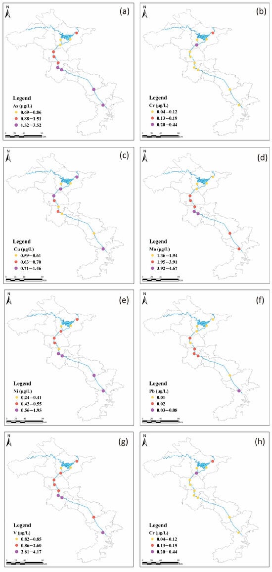Spatial variation of (a) As (b) Cr (c) Cu (d) Mn (e) Ni (f) Pb (g) V (h) Zn concentrations in the Chaobai River.