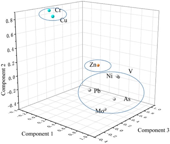 Principal component analysis (PCA) was performed to further identify the sources of dissolved heavy metals in the Chaobai River, with the results presented in Figure 3 [52,53]. Three principal components (PCs) existed in the Chaobai River in Table 3. PC1 had the primary loadings of V, Ni, As, Mo, and Pb, and contributed 51.7% of total variance, demonstrating similar sources of the five DHMs. The Beijing-Tianjin-Hebei (BTH) region is a major coal-consuming area in China, and during coal combustion, trace elements such as V, As, and Pb are often released into the environment [51,54]. Insufficient pollution control measures could lead to the atmospheric deposition or direct discharge of V, As, and Pb into water bodies, which was much more severe near large combustion facilities like thermal power plants [23,27,55,56]. The geological structure of the Beijing-Tianjin-Hebei region is complex, and nickel-containing minerals such as pyroxene and nickel iron ore are widely distributed in rocks within the basin, which are especially released during the weathering process of ultrabasic rocks and diabase [57,58,59]. Therefore, Ni may originate from natural sources. In addition to the Yanjiao national high-tech Industrial Development Zone, the Dachang Chaobai River Economic Zone, and the demonstration zone of emerging industry and the industrial estate of environmental protection, there are also several small furniture manufacturing and metal production enterprises not included in scientific statistics that may provide additional contributions to V, Ni, As, Mo, and Pb concentrations [60]. Therefore, PC1 represents a mixed origin influenced by industrial (thermal) pollution and natural processes.