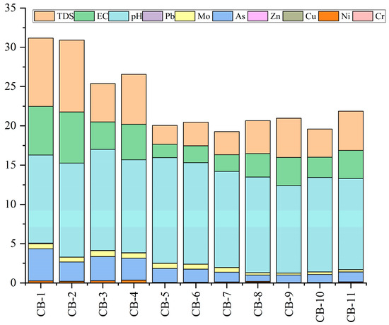 In this study, 10 parameters of water quality (pH, EC, TDS, Ni, Cr, Cu, Zn, Pb, As, and Mo) were selected for the WQI calculation in Table 5, and the WQI results are exhibited in Figure 4. The average WQI value of the Chaobai River was 23.35, indicating excellent water quality. WQI gradually declined from downstream to upstream in the Chaobai River, with the highest in site CB-2 and the lowest in site CB-7. The sampling site CB5-11 had excellent water quality (WQI < 25), and site CB1-4 had good water quality (25 < WQI < 50). Therefore, according to the WQI index, the natural water of the Chaobai River was acceptable for drinking. It is worth noting that this study only calculated WQI from the perspective of heavy metals. However, according to previous discussions about metal contents and sources, the potential risks of these ions still exist, although the WQI results of the Chaobai River are quite good. Frequent anthropogenic activities including agriculture and industry in these urban districts could lead to the increase in DHM content and the alteration of physicochemical parameters in river water [63]. According to recent governmental policies, the improved water quality in the upper reaches of the river is attributed not only to effective water resource management, but also to the dilution effects from high-flow tributaries, which help reduce impurities. Moreover, as shown in Figure 4, the primary contributions of WQI were the physicochemical parameters of EC, TDS, and pH, whereas the metal contribution is relatively lower, except for As and Mo, indicating potential health risks of As and Mo to human health.