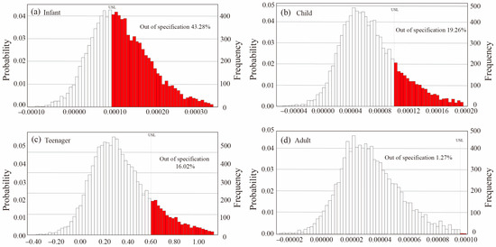 Due to the limited non-carcinogenic dermal risk of metals in the Chaobai River, the analysis excluded carcinogenic risks via skin absorption. The urban residents were divided into four age groups to reveal a more accurate carcinogenic risk evaluation: infant (0~2 years old), child (2~6), teenager (7~16), and adult (≥17). According to the calculation, the limitation range of the carcinogenic risk of As was 10−6~10−4. The predicted results are shown in Figure 6, which indicated that the average carcinogenic risks in these age groups were 1.21 × 10−4 for infant group, 6.89 × 10−5 for child group, 6.28 × 10−5 for teenager group, and 1.72 × 10−5 for adult group, respectively. Meanwhile, the 5% and 95% simulated risks were calculated as 1.50 × 10−5 and 2.61 × 10−4 for the infant group, 8.10 × 10−6 and 1.56 × 10−4 for the child group, 6.83 × 10−6 and 1.43 × 10−4 for the teenager group, and 2.38 × 10−6 and 3.70 × 10−5 for the adult group, respectively (Table S6). Furthermore, around 19.26% of As in the child group and 16.02% in the teenager group fell out of the allowable values, whereas only 1.27% of As in the adult group exceeded the acceptable ranges, implying a much lower carcinogenic risk of As in the adult group. On the contrary, 43.28% of As in the infant group far exceeded the acceptable standards, revealing a greater health threat for young ages, especially for the infant group.