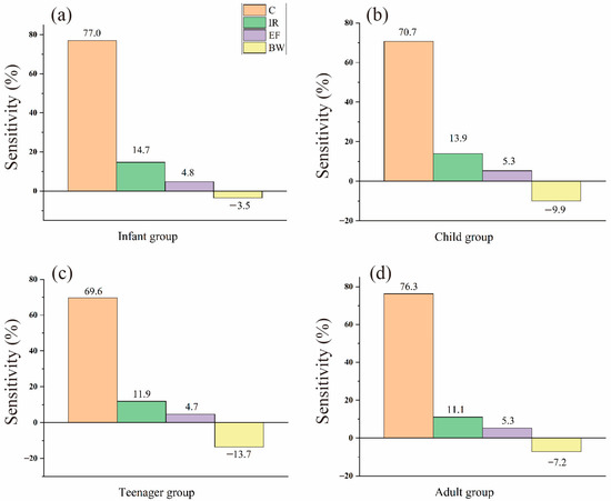 Meanwhile, in order to investigate the parameters that could affect the calculated carcinogenic risks, we performed a sensitivity test in this study. Figure 7 illustrates the parameter contributions of risk uncertainty on As, and the most significant parameters in the infant and teenager groups followed the order of As content > ingestion rate > exposure frequency > body weight. However, body weight is relatively more influential in the child and adult groups than exposure frequency.