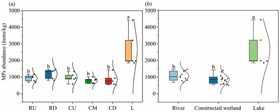 Figure 1. Comparison of MP abundance in different sampling areas (a) and different types of inland wetlands (b). Different superscript lowercase letters indicate significant differences (p < 0.05). RU—river upstream; RD—river downstream; CU—constructed wetland inlet; CM—constructed wetland midstream; CD—constructed wetland outlet; L—lake wetland.