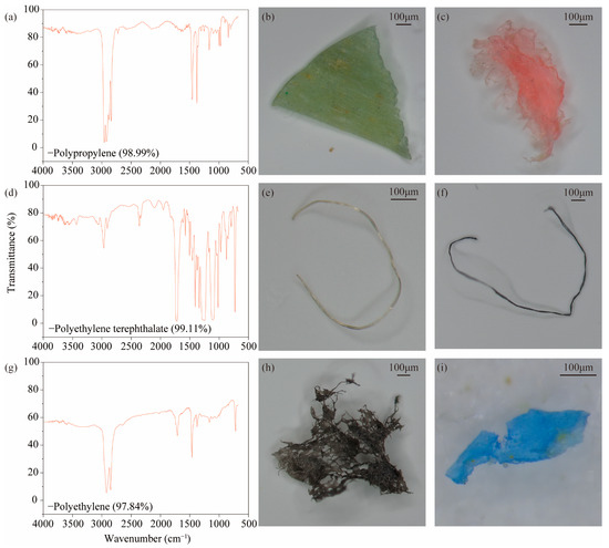 Figure 2. Infrared spectra of typical MPs identified by μ-FTIR, PP (a), PET (d), and PE (g), with percentages in parentheses representing the match of the sample infrared spectra to the standard infrared spectra. Pictures of typical MPs observed under stereomicroscope, fragments (b), films (c,i), fibers (e,f), and foams (h).
