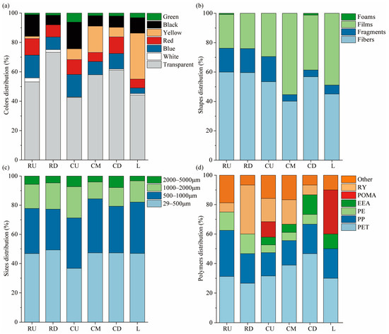Four shapes were detected in all wetlands soil samples, including fibers (51.2%), films (38.5%), fragments (10.1%), and foams (0.2%) (Figure 3b). The fragments are predominantly found in RU, RD, and CU, while the films are predominantly found in CM, CD, and L (Figure 3b). Fiber abundance was higher in RU and RD associated with fisheries aquaculture activities (Figure 3b).