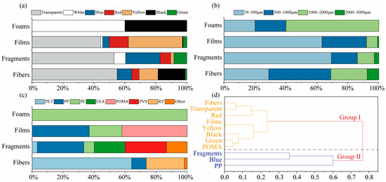 Figure 4. Distribution of colors (a), sizes (b), and polymers (c) in different MP shapes. Cluster analysis of the main characteristics of MPs (d).