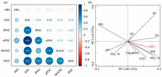 Figure 5. Relationship between MP abundance and environmental factors. (a) Spearman correlation analysis of MPs with soil organic carbon and its components (* p < 0.05, *** p < 0.001); (b) PCA of MP abundance and soil physicochemical properties.