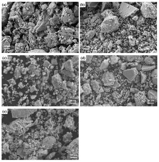 Representative SEM micrographs of the synthesized materials are shown in Figure 1. All materials presented irregular shapes and heterogeneity in the particle sizes. This was expected because the method chosen to produce them was the chemical precipitation method due to its simplicity and low energy requirements.