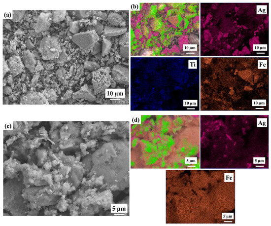 EDX elemental mapping analysis revealed that on the surface of the composite materials, iron (Fe), titanium (Ti), and silver (Ag) were distributed along all the surface of the materials, as can be seen in Figure 2 for Ag3PO4@Fe3O4 and Ag3PO4@1-TiO2-Fe3O4. Fe3O4 rods were found in different sizes but homogeneously along the image, serving as support for Ag3PO4. However, it should be noted that higher concentrations of Ag were found in clusters throughout the surface. These clusters presented variable sizes.