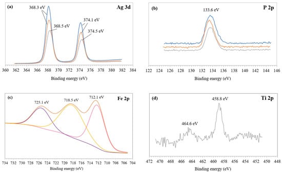 XPS spectra of Ag3PO4 (blue), Ag3PO4@Fe3O4 (orange), and Ag3PO4@1-TiO2-Fe3O4 (grey). (a) Ag 3d, (b) P 2p, (c) Fe 2p, and (d) Ti 2p.