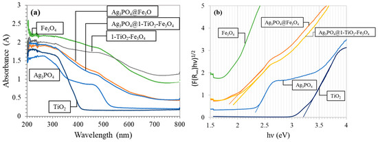 We observed that, as expected, TiO2 had the widest bandgap (3.20 eV). The bandgap of Ag3PO4 was 2.36 eV, which agrees with values reported by other authors [16,67]. The bandgap of Fe3O4 was the lowest (1.87 eV). This value is similar to that reported by another author for the synthesis of Fe3O4 at pH 10 and at room temperature (1.76 eV at 25 °C) [68].