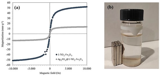 The saturation magnetization was 51.6 emu·g−1 for 1-TiO2-Fe3O4 and 13.2 emu·g−1 for Ag3PO4@1-TiO2-Fe3O4. The decrease in the magnetization observed for the Ag3PO4@1-TiO2-Fe3O4 composite can be attributed to the presence of the non-magnetic Ag3PO4. Nonetheless, the composite material presents enough magnetization to be recovered with a magnet in a few seconds. Figure 6b shows a picture of the Ag3PO4@1-TiO2-Fe3O4 material collected with an external magnet.