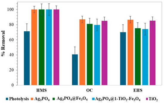 The adsorption of the contaminants on the photocatalysts was negligible. The photocatalytic experiments continued until the accumulated irradiation reached 40 kJ·L−1. Results are shown in Figure 7. It can be observed that 70% of the HMS and EHS was removed through photolysis. OC was less susceptible to photolysis but 40% was removed with exposure to sunlight.