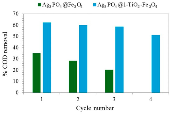 Thus, as reported by other authors [36], Fe3O4 particles are expected to be charged positively at pH values below 7.1 (pHPZC), and, for this reason, the addition of phosphate ions at pH 4.12 during the Ag3PO4@Fe3O4 synthesis favors the electrostatic interaction of the negative phosphate groups with the positively charged magnetic particles. The same is applicable to 1-TiO2-Fe3O4, which has a pHPZC of 7.0.