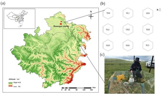 The Zoige peatland, which is located in the northeastern part of the QTP at an elevation of 3400 to 3900 m, spans an area of roughly 16,000 km2 (Figure 1a). This region features a cold temperate and plateau humid climate, which is characterized by an exceptionally long frost period. The average annual temperature varies between −0.7 °C and 1.1 °C, and the average annual precipitation falls between 650 mm and 750 mm, with the majority occurring from June to September [,]. The relative humidity is around 78%. The alpine meadow was dominated by Carex meyeriana, C. muliensis, Blysmus sinocompressus, Carex secbrirostris, and C. tibetikobresia.