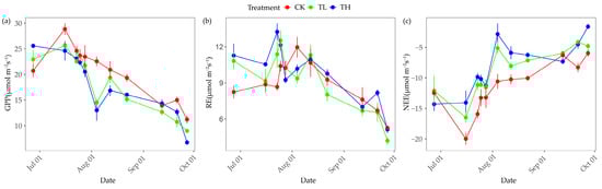 Warming significantly reduced the GPP and NEE in both the TL and TH treatments (p < 0.001), and it had no significant effect on RE (p > 0.05) (Table 3). From June to September, GPP gradually decreased over time, and the average value of GPP was 21.19 μ mol m−2s−1 in the CK plots (Figure 2). GPP was 10.05% and 13.31% lower on average in the TL and TH treatments, respectively, than in the CK (Table 2). RE initially increased and then decreased, and its peak value in the CK was observed on August 4th. The peak RE in the warming treatments occurred about 10 days earlier than that in the CK. NEE gradually increased over time, with an average value of −11.98 μ mol m−2s−1 (Table 2). The absolute value of NEE decreased by an average of 21.00% and 30.00% in the TL and TH treatments, respectively. Significant interactions of time and treatment with GPP and NEE were observed. In August, GPP was significantly lower and NEE was significantly higher in both the TL and TH plots than in the CK (Figure 2).