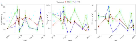From June to September, E, T, and ET fluctuated within the ranges of 0.16–0.46 mmol m−2s−1, 0.20–1.46 mmol m−2s−1, and 0.36–1.73 mmol m−2s−1, respectively, and no consistent trend was observed (Figure 3, Table 2). T and ET were 36.98% and 23.71% higher in the TL treatment, respectively, than in the CK, and these differences were significant (p < 0.01). In contrast, the TH treatment did not significantly alter T and ET (p > 0.05, Table 3). The average E was lower in both warming treatments than in the control, but the effect was not significant (p > 0.05, Table 3). Significant interactions of time and treatment with E, T, and ET were observed. As shown in Figure 3, E, T, and ET showed larger fluctuations in both the TL and TH treatments than in the CK.