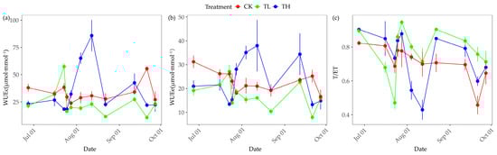 WUEc and WUEe were 31.38% and 28.17% lower in the TL treatment than in the CK, respectively (Table 2, p < 0.05). T/ET was 23.71% higher in the TL treatment than in the CK (p < 0.05). No significant changes in WUEc, WUEe, or T/ET were observed at the beginning and end of the growing season in the TH treatment (p > 0.05). However, significant interactions of time and treatment with WUEc, WUEe, and T/ET were observed. Both WUEc and WUEe were greater in the TH plots than in the CK and TL plots during the mid-growing season, from late July to mid-August (Figure 4a,b). In contrast, T/ET was lower in the TH plots than in the CK and TL plots (Figure 4c).