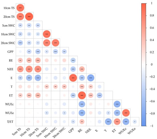 Pearson correlations among the soil water content, soil temperature, carbon and water fluxes, and water use efficiency. ‘*’, ‘**’, and ‘***’ represent significant effects at p < 0.05, p < 0.01, and p < 0.001, respectively. SWC, soil water content; TS, soil temperature; GPP, gross primary productivity; RE, ecosystem respiration; NEE, net ecosystem carbon exchange; E, soil evaporation; T, plant transpiration; ET, evapotranspiration; WUEc, canopy water use efficiency; WUEe, ecosystem water use efficiency; T/ET, ratio of soil evaporation and evapotranspiration.