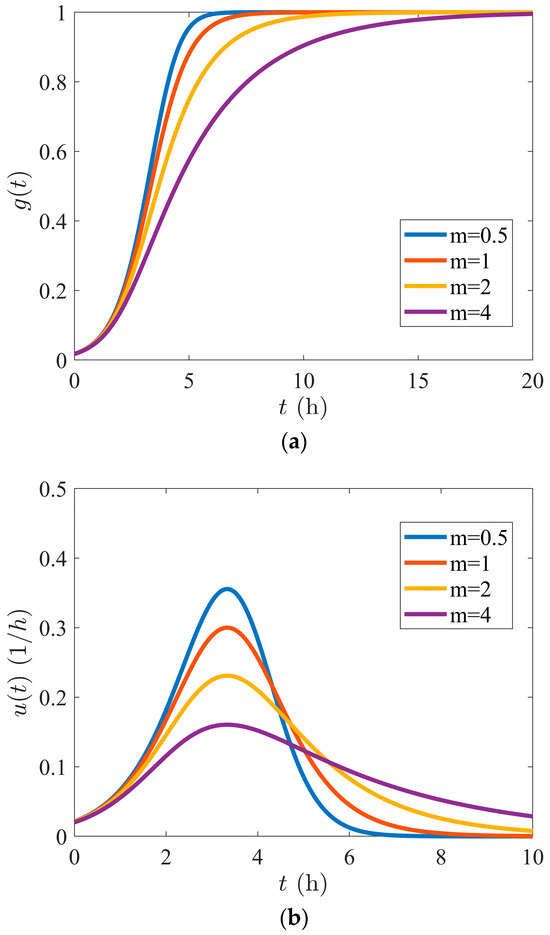 In the rising stage, has exponentially fast growth, and the parameter tells us how fast the impulse grows. From Figure 1c,d, it can be seen that as the growth constant becomes larger, the density becomes more concentrated around the peak time and the S-hydrograph has a steeper slope. The larger the growth constant, the less cumulative volume loss at the initial time .