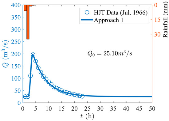 The flood process calculated from Equation (9) is represented by solid lines in Figure 4. The peak discharge is 464.67 under the total rainfall 65 mm in 4 h, which can be used as the design flow for river improvement in the Fu Stream Basin. The curve depicting the entire process of flood, from rise to peak to fall, is called the flood hydrograph, and the total amount of flowing-out water is called the total flood volume. According to Figure 4, the duration of the flood is about 61 h, and integrating the curve yields a total flood volume of approximately 4671.12 . The flood peak occurs at 4.01 , which means that the rising section of the flood accounts for 6.57% of the total duration, while the integration shows that the total flood volume during the 0–4.01 period is 946.66 , accounting for 20.27% of the total flood volume. The average discharge in the rising section of the flood process is 236.07 , while in the falling section of the flood process, the value is 65.35 , which is about 361.24% lower than the rising section. From this, it can be seen that disaster prevention and early warning in the rising stage of floods are particularly important. If real-time rainfall data are applied in Equation (9), we can obtain a real-time flood warning system for the Fu Stream Basin, which can significantly reduce the destruction of flood disasters.