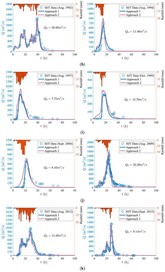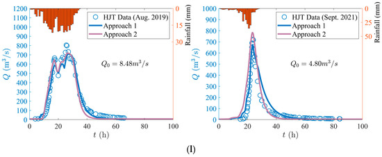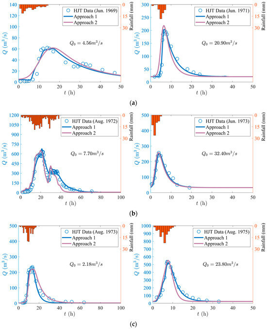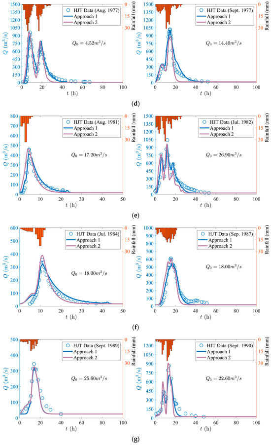 (a) As depicted in Figure 5, the prediction of peak occurrence time from the GUH is well consistent with the actual situation, regardless of whether the rain pattern is single or multi-peak. Additionally, most flood events can also be well-fitted by Approach 2 when it comes to calculating flood peak size and flood peak occurrence time.