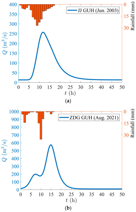 (b) The prediction of peak flood discharge from the GUH is accurate. The peak time lag reflects the response speed of flood to rainfall. The smaller peak time lag, the faster the flood responds and the more difficult it is to take prevention measures in advance. Mountainous and hilly areas account for approximately 70.4% of the total area of Zhejiang. The slopes within the river basins are large, leading to a fast confluence speed and a rapid flood response speed with a small peak time lag.