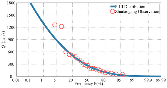 After the duration of annual maximum discharge extended from 1957 to 2021, the P-III distribution is calculated, as shown in Figure 11, where is raised to 0.995. According to the P-III distribution in Figure 11, the 50-year recurrence flood is 949.1 , with a decrease of 15%. The maximum discharge 1260.0 corresponds to a return period of 256 years on the P-III curve.