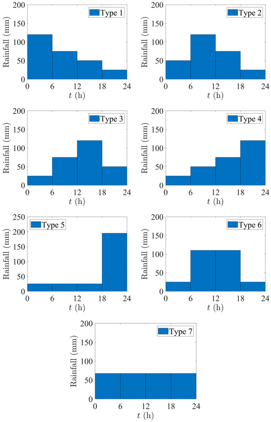 We propose seven types of rainstorms, each with a total amount of 270 mm over 24 h and according to temporal distribution of rainstorm, to study the effect of rainstorm process on flood peaks, as listed in Table 6. In Table 6, the 270 mm rainfall is divided into four segments at 6 h intervals for each rain type. The time of the heaviest rainstorm continuously moves from the first 6 h to the fourth 6 h in rainstorm types 1–4. The maximum value of 120 mm for type 1 occurs in the first 6 h, while that for type 4 occurs in the fourth 6 h period. The maximum rainstorm of type 5 also occurs in the last 6 h, but the maximum values are different. The rainstorm of types 6 and7 is symmetrically distributed and, especially, type 7 is evenly distributed. Figure 12 shows the distribution of rainstorms.