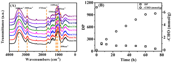 ATR-FTIR spectra (A) and content of the aldehyde groups and DP (B) of the pristine cellulose and oxidized cellulose membranes associated with oxidation time.