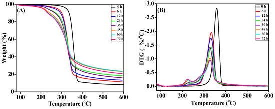 Thermal stability (A) and DTG (B) curves of the cellulose membranes before and after oxidation with different reaction times, respectively.