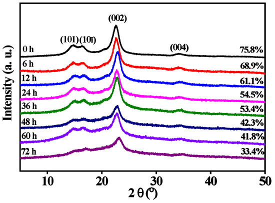 The four diffraction peaks of cellulose fabrics with different oxidation times were located at 14.8°, 16.3°, 22.6°, and 34.2°, respectively, corresponding to cellulose lattice planes of (101), (10ī), (002), and (040), which confirmed that the crystal structure of cellulose and oxidized cellulose membranes remained unchanged and remained as cellulose I type [44]. However, the crystallinity of the pristine cellulose decreased continuously with oxidation time. This was due to the oxidation reaction that converted the hydroxymethyl groups at positions C2 and C3 of cellulose into aldehyde groups and broke the ether bond of cellulose chains, which damaged the crystal regions of the cellulose and continuously reduced the crystallinity from 75.8% to 33.4%. It was also determined that the oxidation reaction occurred not only in the amorphous regions, but also partially in the crystal region or surface, which resulted in a reduction in crystallinity. Therefore, the optimized DACF membrane, considering the content of aldehyde, mechanical properties associated with DP, and crystallinity, was the DACF membrane oxidized for 24 h.
