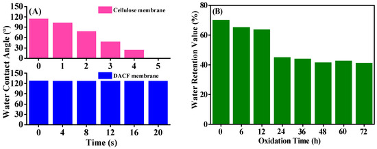 The surface properties of the pristine cellulose and the DACF membrane were investigated using their water contact angle and water retention to understand the effects of the aldehyde groups. The changes in water contact angles of the cellulose and DACF membranes with time are shown in Figure 5A.