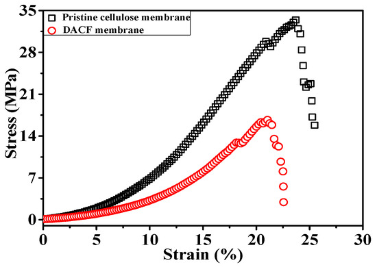 The stress–strain curves of the pristine cellulose and DACF membranes were obtained, as illustrated in Figure 6.
