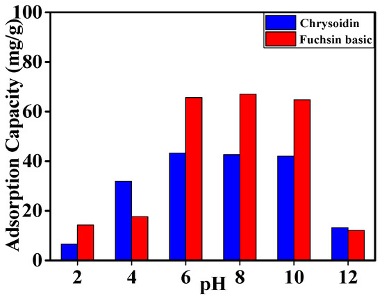 The adsorption performance of the DACF membrane towards fuchsin basic and chrysoidine was affected by the solution’s pH, as shown in Figure 8.
