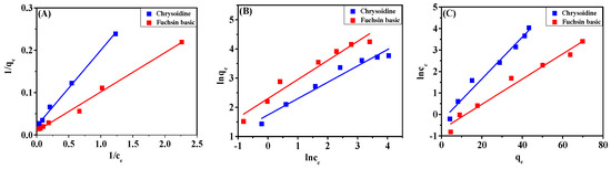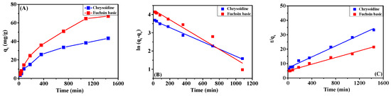 Adsorption capacity vs. time (A), pseudo-first-order kinetics (B), and pseudo-second-order kinetics (C) of the DACF membrane for the adsorption of chrysoidine and fuchsin basic, respectively.